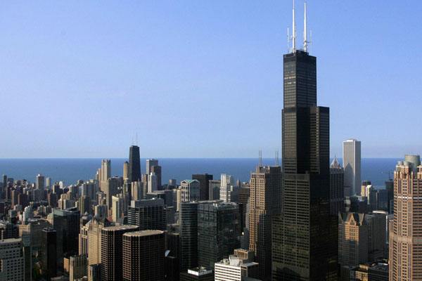 1970年建成的110層、高443m的美國(guó)芝加哥西爾斯大廈;
